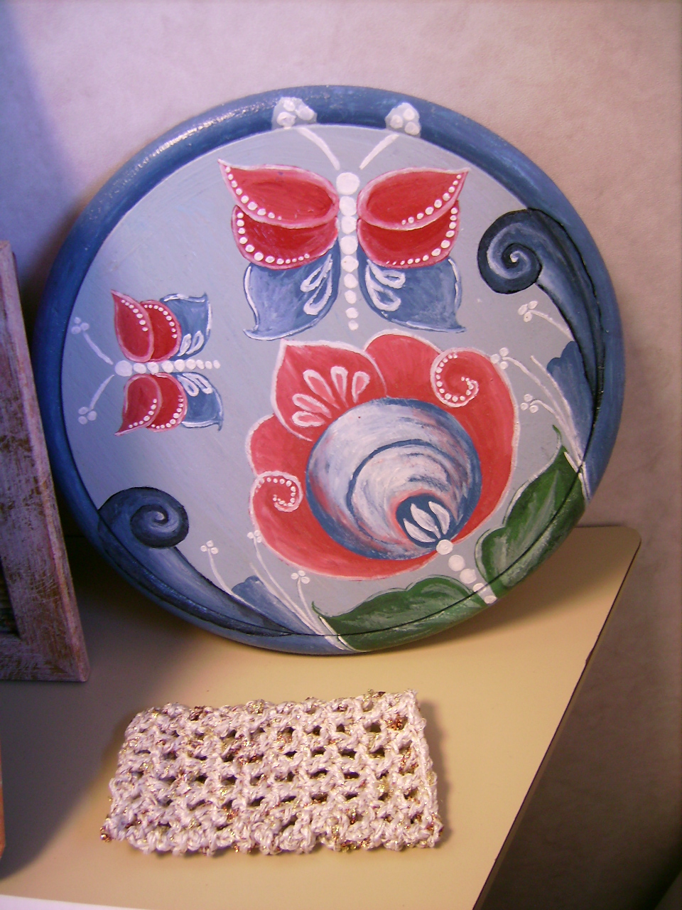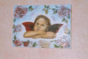 Ici, un petit tableau avec un angelot et des roses, et de la peinture acrylique.