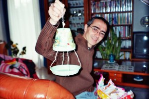 Et voici un cadeau que j’ai fait pour mon beau-frère : une mangeoire pour les oiseaux. Dans la soucoupe, on met les petites graines. On suspend le tout dans un arbre, si vous avez un jardin, évidemment.