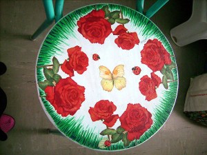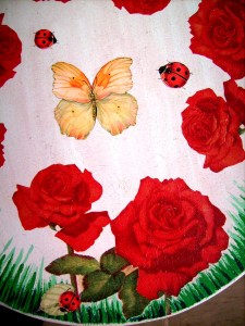 L’assise d’une de mes chaises s’est cassée. Je l’ai donc refaite avec un morceau de bois, puis je l’ai décorée. Les roses sont des serviettes en papier, et les papillons et les coccinelles sont en papier de découpage Stamperia. Le fond et l’herbe sont peints à la peinture acrylique.