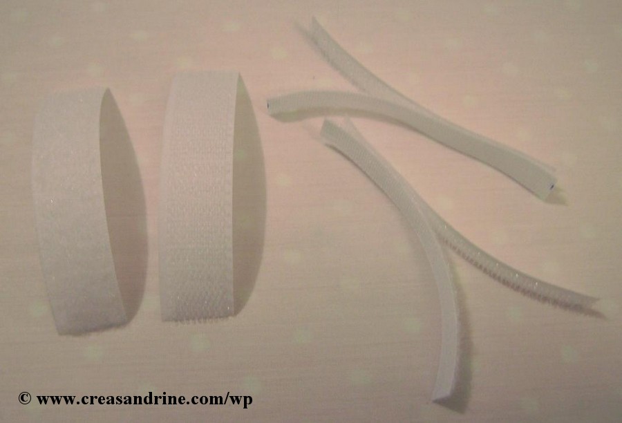 Prendre du velcro (ou scratch ou auto-agrippant, selon les termes) de 2 cm de large. Couper une bande de 9 cm de chaque partie : velours et crochet. Et couper chaque bande sur la longueur. Cela vous fait 2 bandes de 9 cm sur 1 cm.