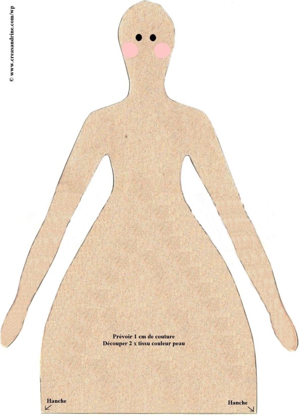 Le patron du corps mesure 32 cm, et celui de la jambe mesure 36,2 cm. Au final, cela fera une poupée d’environ 64 cm.