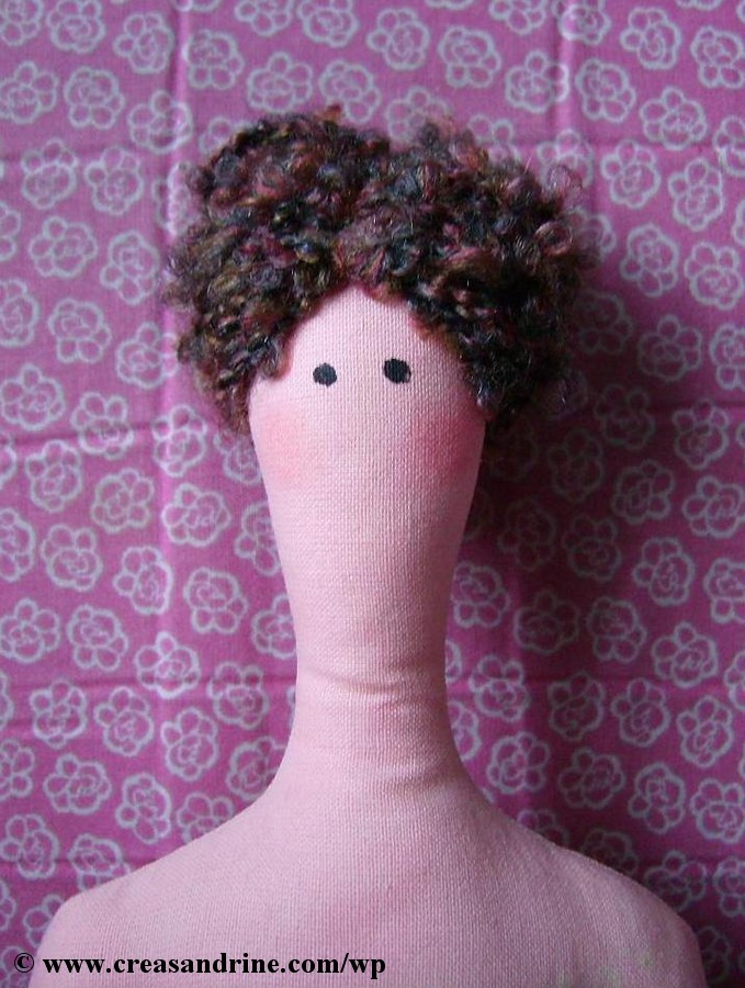 …ma poupée Tilda avec des cheveux. La coiffure n’a rien d’extraordinaire, mais je trouve la laine très jolie. C’est un bout de laine que l’on m’a donné il y a des années, et donc, je ne pourrai pas vous dire d’où elle provient. Voici son portrait :