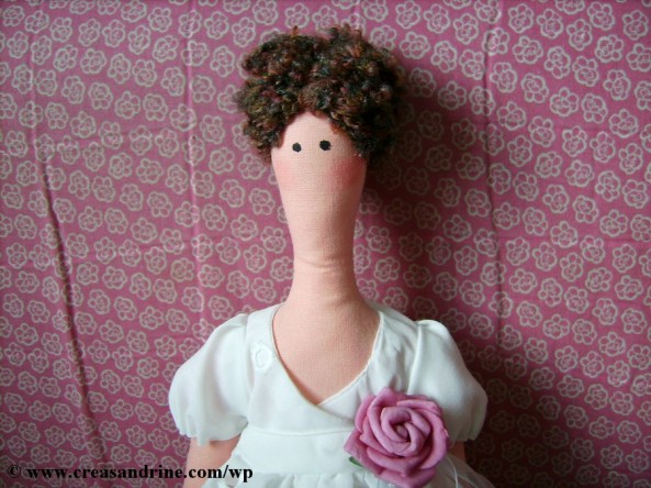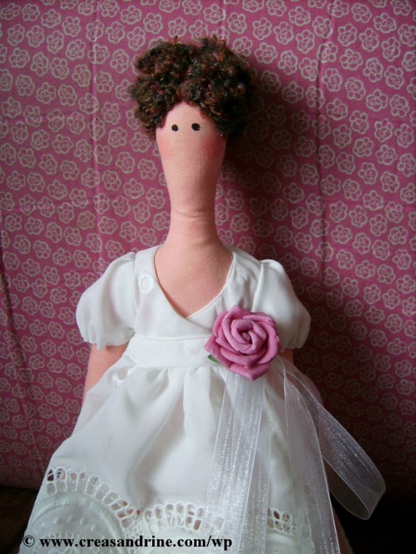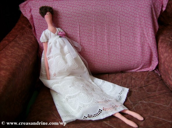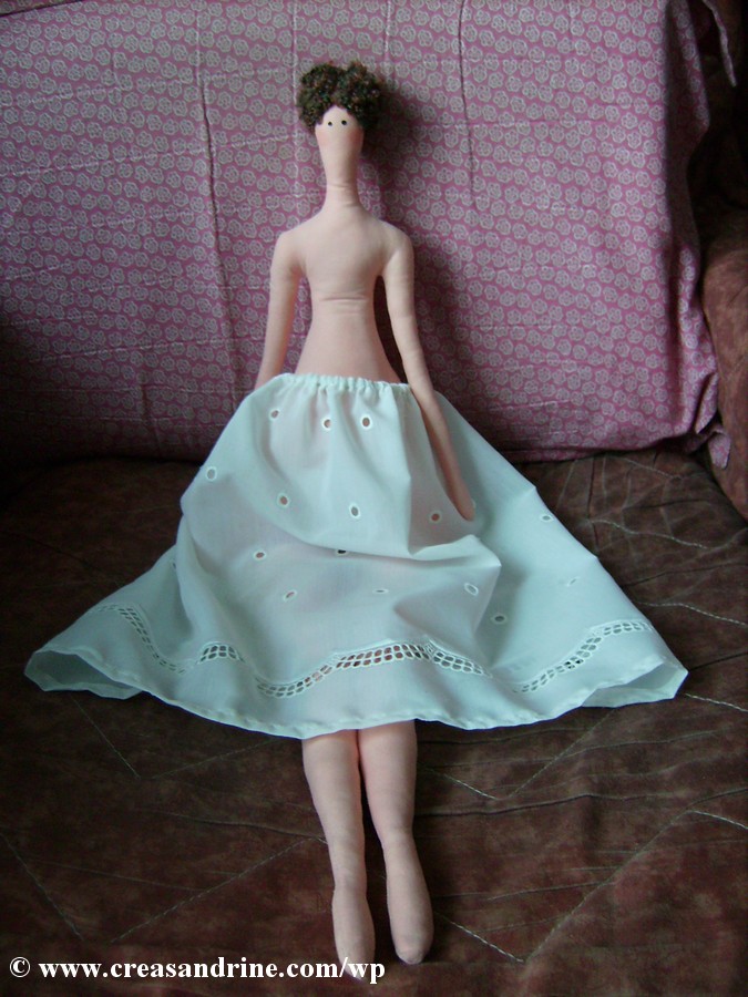 Pour les vêtements, j’ai commencé par lui faire un jupon taille basse. Puis, je lui ai fait la robe tiré du livre « l’atelier de Tilda » de Tone Finnanger.